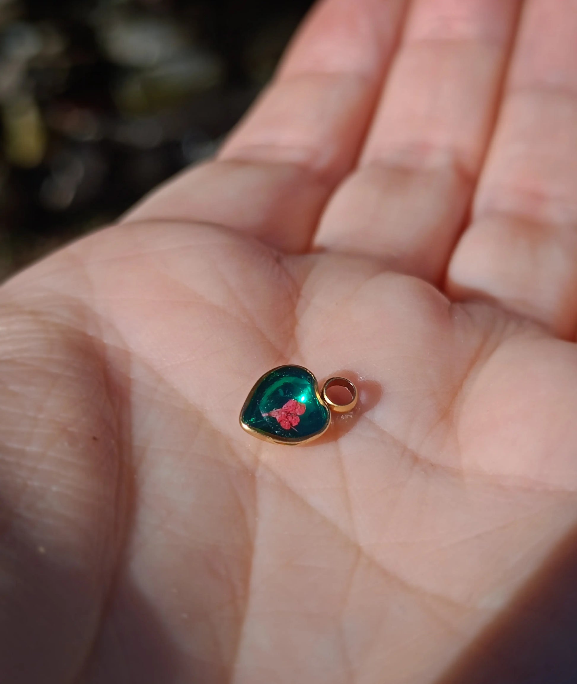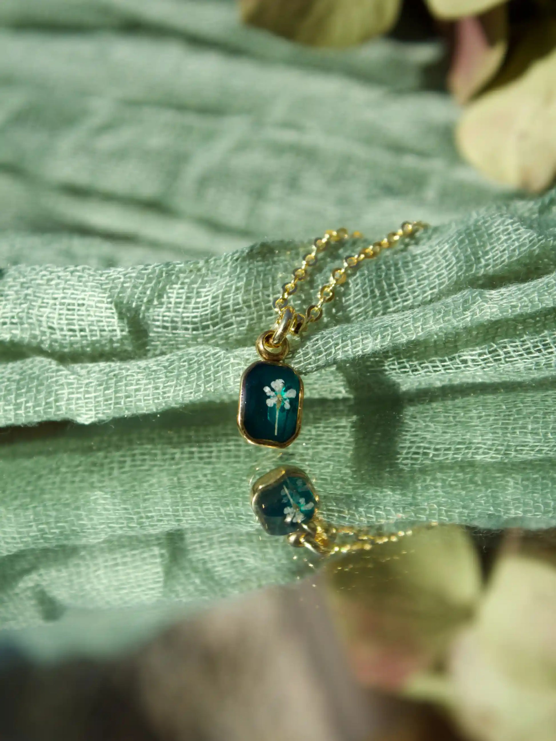LAVORAZIONE: Il fiore viene raccolto ed essiccato con cura tramite pressatura, poi inglobato gradualmente in strati di resina epossidica.