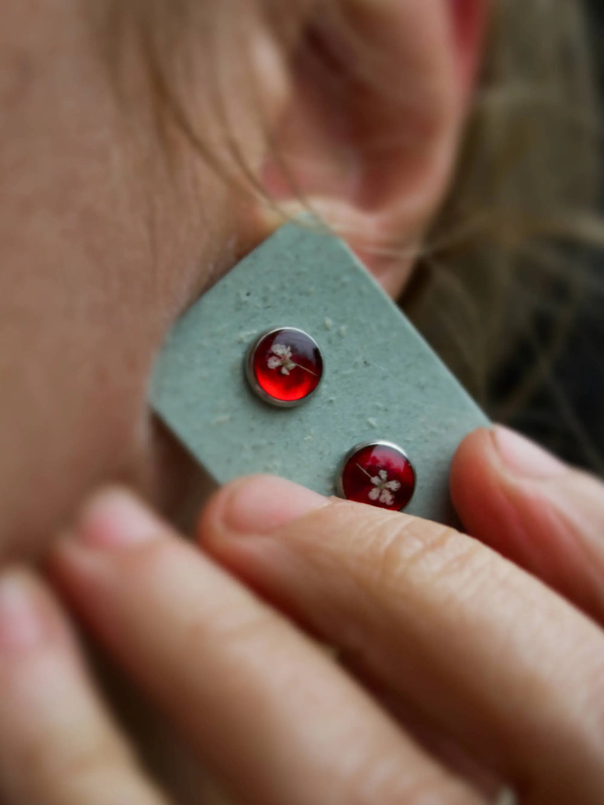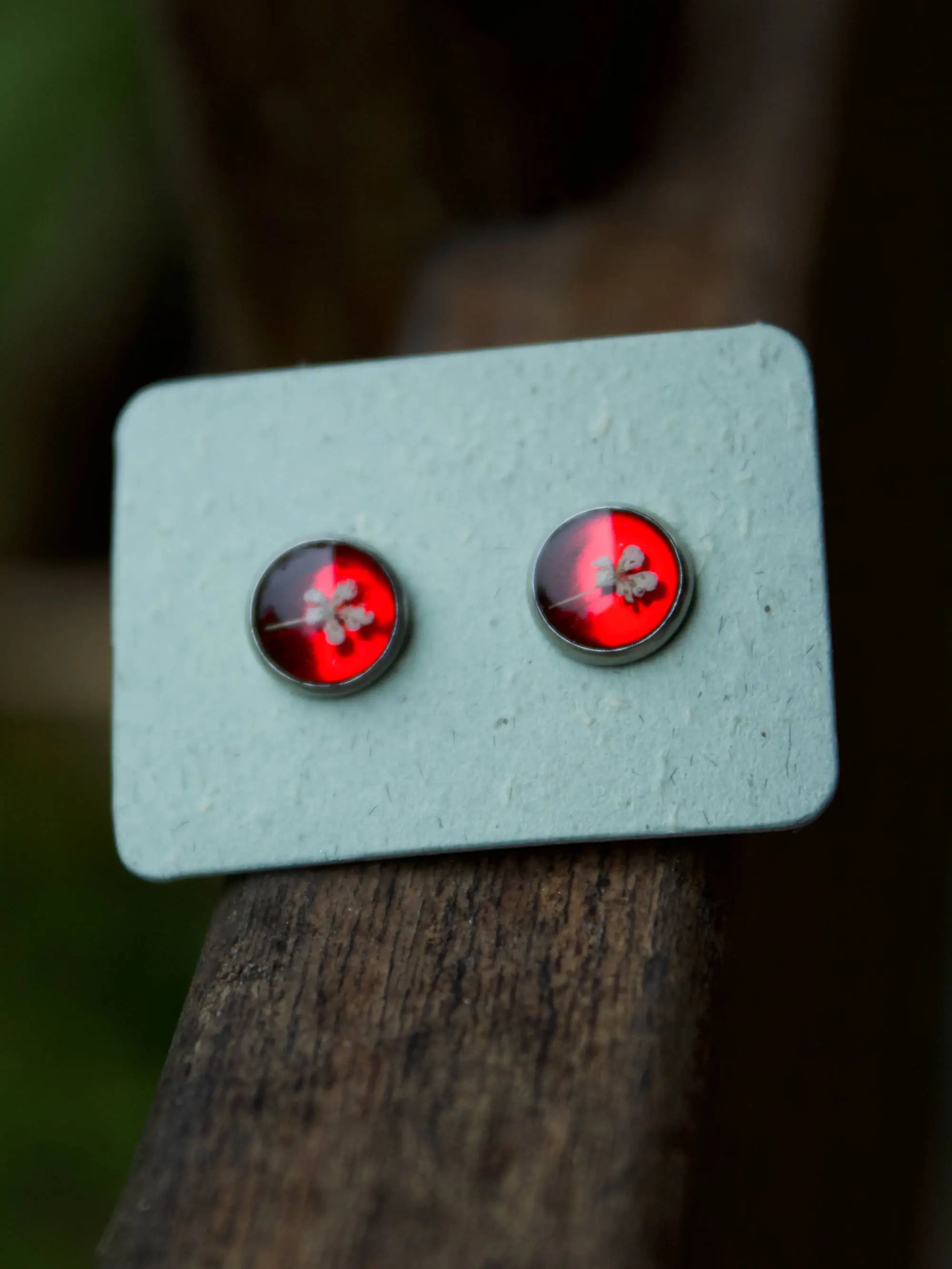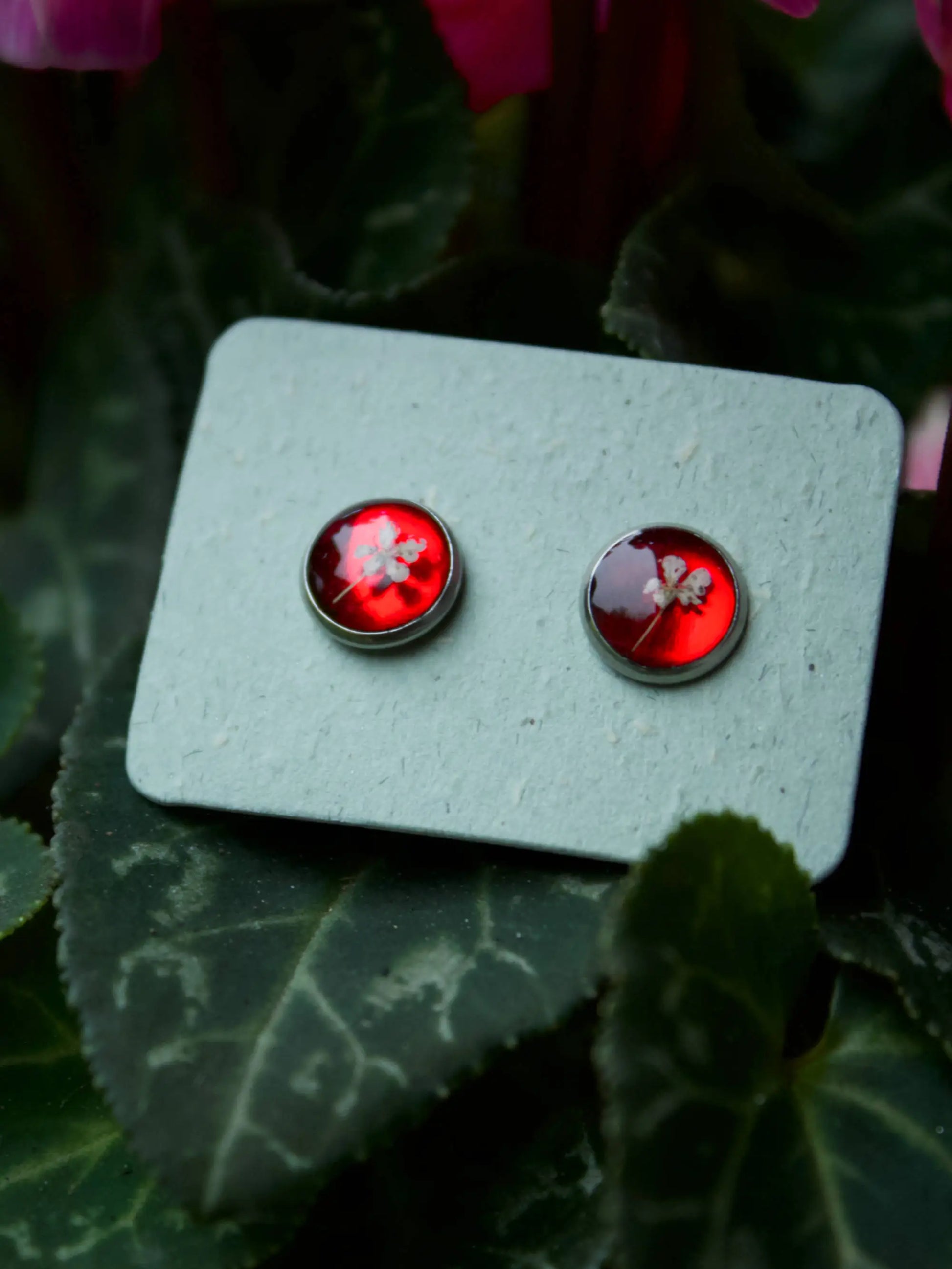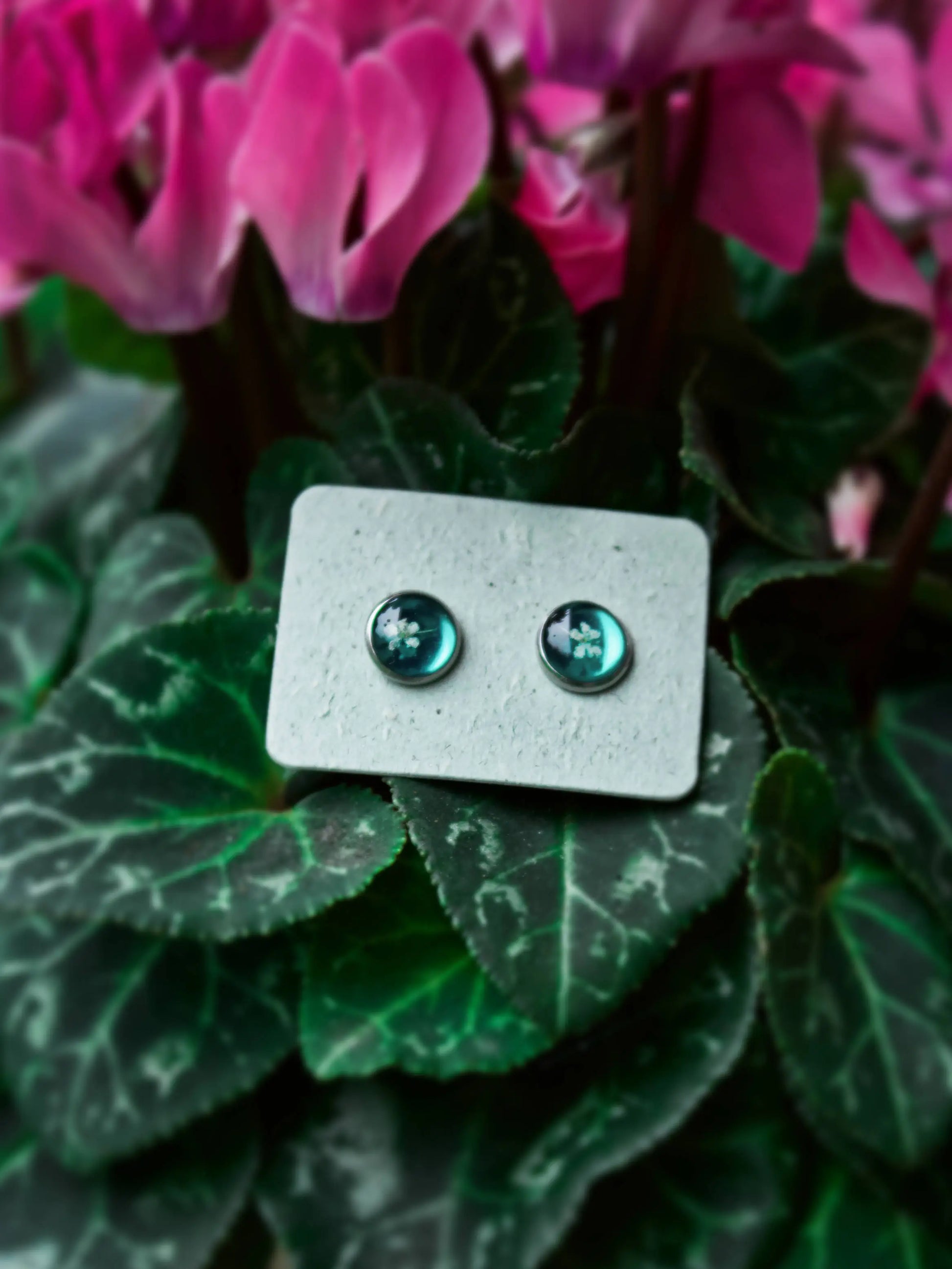 In questi orecchini a perno ci sono due piccoli fiori di Carota Selvatica immersi nella resina.